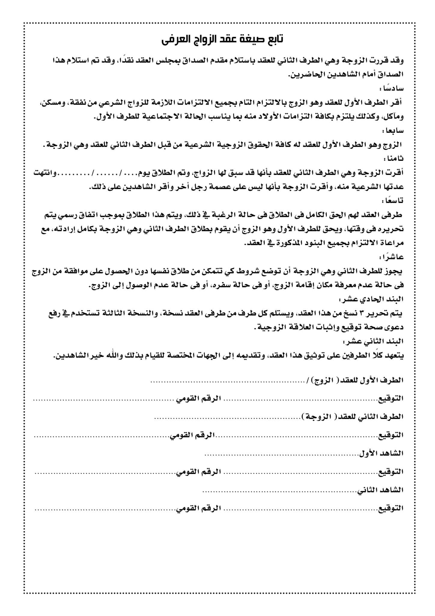 الزواج العرفي من الأمور الشائكة في مصر وعدد كبير من البلدان العربية خاصة أن البعض يراه غير جائز شرعًا في حين أكد عدد كبير من علماء الدين الإسلامي أنه حلال إذا تم من خلال تحقيق شروط الزواج الشرعي مثل الشهود والرضا من الطرفين والإشهار، موقع سوالفنا يقدم لكم صيغة عقد الزواج العرفي الحلال.